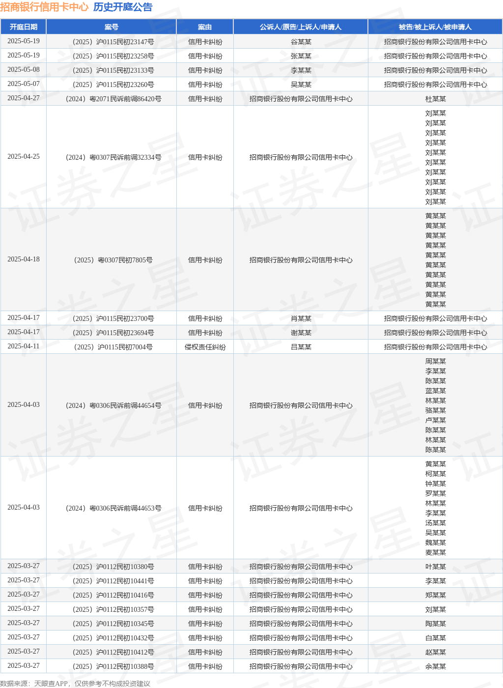 案号:(2025)沪0101民初1307号审理法院:上海市黄浦区人民法院案由:金融借款合同纠纷当事人信息: 原告/上诉人:招商银行股份有限公司信用卡中心 被告/被上诉人:张某某开庭日期:2025年2月26日根据统计,近一年内以招商银行股份有限公司信用卡中心为当事人的历史开庭公告有11879则,其中案由为“信用卡纠纷”的公告以9763则居首,其次为“金融借款合同纠纷”有1966则,“合同纠纷”有87则。历史开庭公告(前20条)如下:
